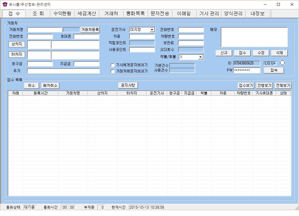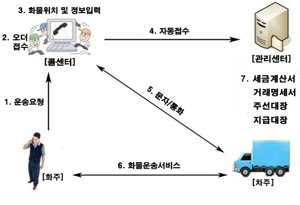 ④ 접수 기능: 화주 및 차주의 전화 주문과 요구를 신속하고 효율적으로 처리하며, 접수에서부터 배차는 물론 사후까지도 관리하고 표시하는 기능들입니다.