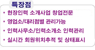 - 현장 인력에 대한 소개, 파견 및 관리를 효율적으로 할 수 있어 인력 관리 사업의 창업에 적합합니다.