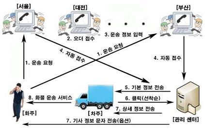 ① 스마트폰 인터넷: 콜센터에서 차주에게 인터넷으로 운송 대상 화물의 정보를 실시간으로 제공하며, 차주가 스마트폰에서 운송 오더를 선택하면 다른 차주는 그 운송 오더를 선택할 수 없게 하는 기능을 포함합니다.